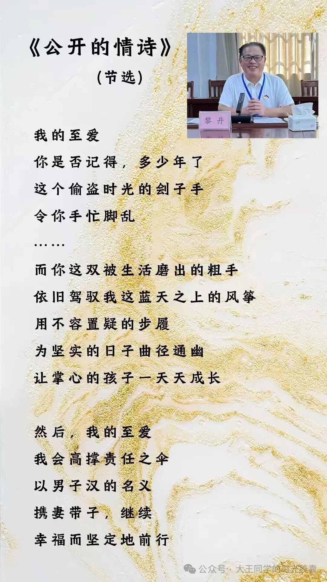 我抽空拜读了他的几篇诗歌,如《在大井的日子》、《童年的记忆》、《佛子岭的夜》……黎丹老师在教学之余,投身到文学诗歌的创作中,几十年如一日、十年磨一剑、一笔一划、一节一篇,一和一合、具象与抽象,虚与实、感性与理性,人性与哲理……岁月如歌,把酒当歌,用文彩编织成感人的希望田野之歌。