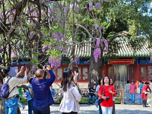 孔庙国子监百年紫藤进入盛花期,园区发布“紫藤观赏地图”。“五一”期间将推出紫藤主题文创,花期活动持续至五月底。详情>>